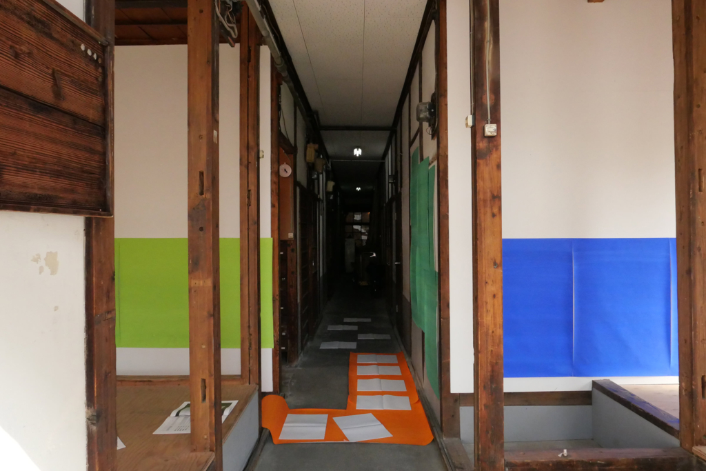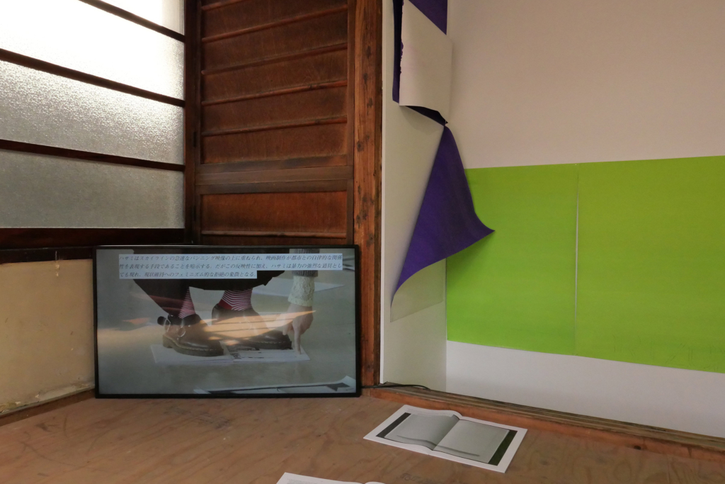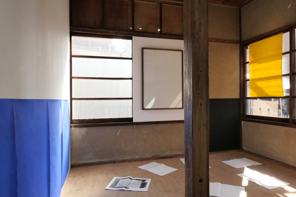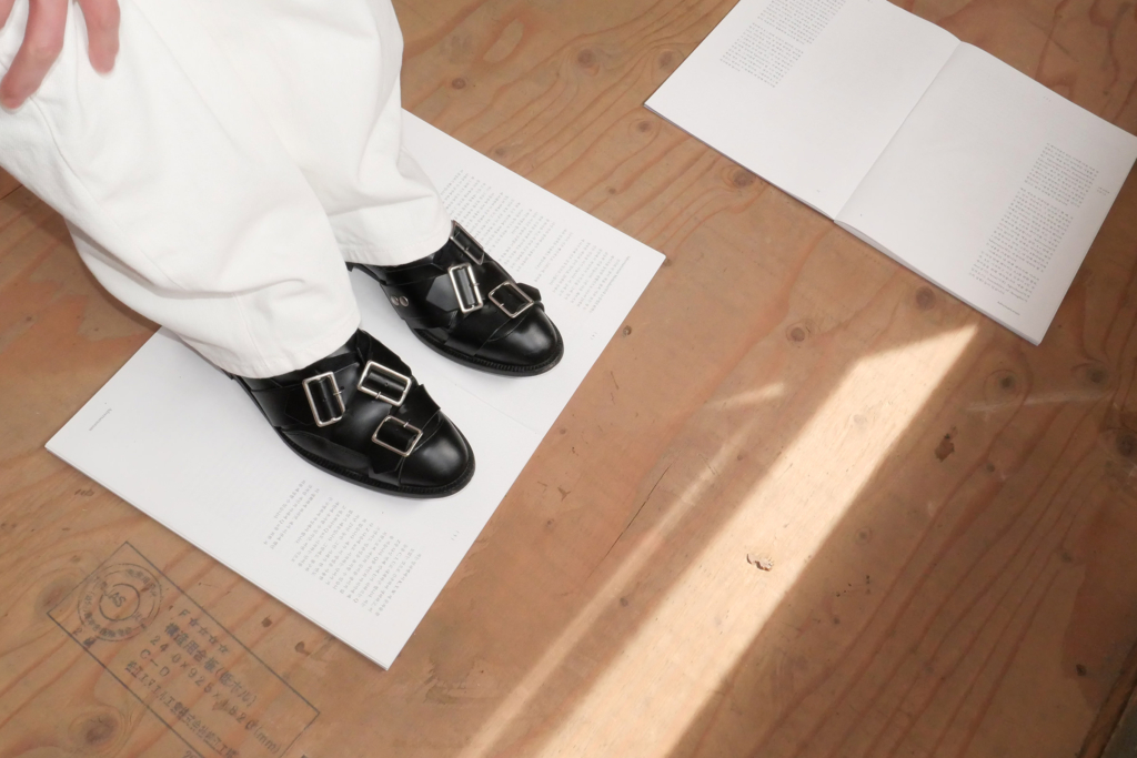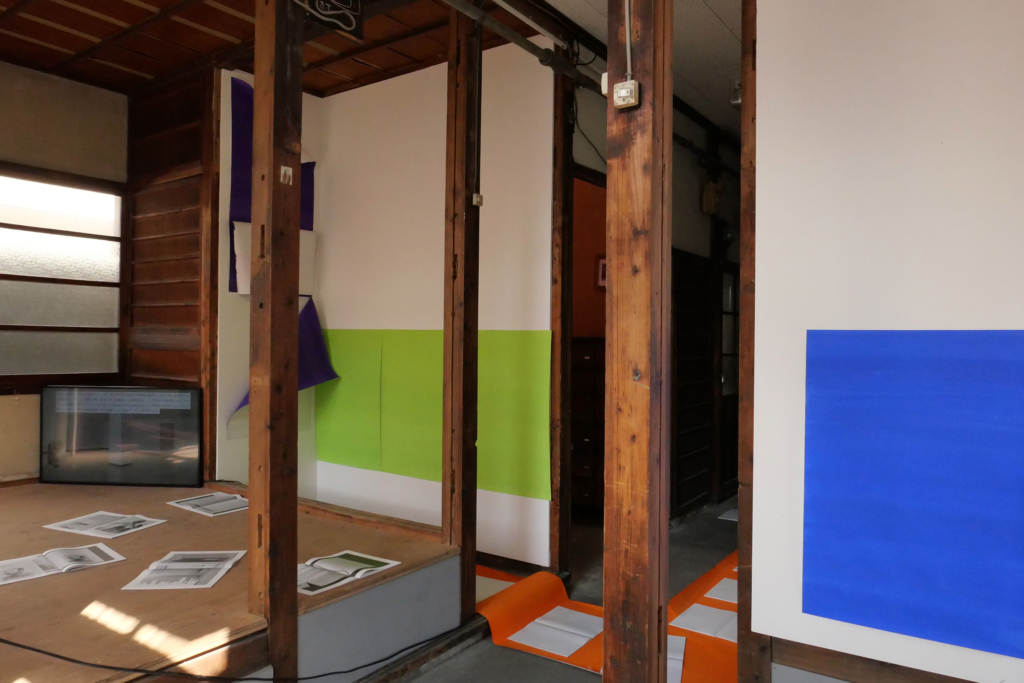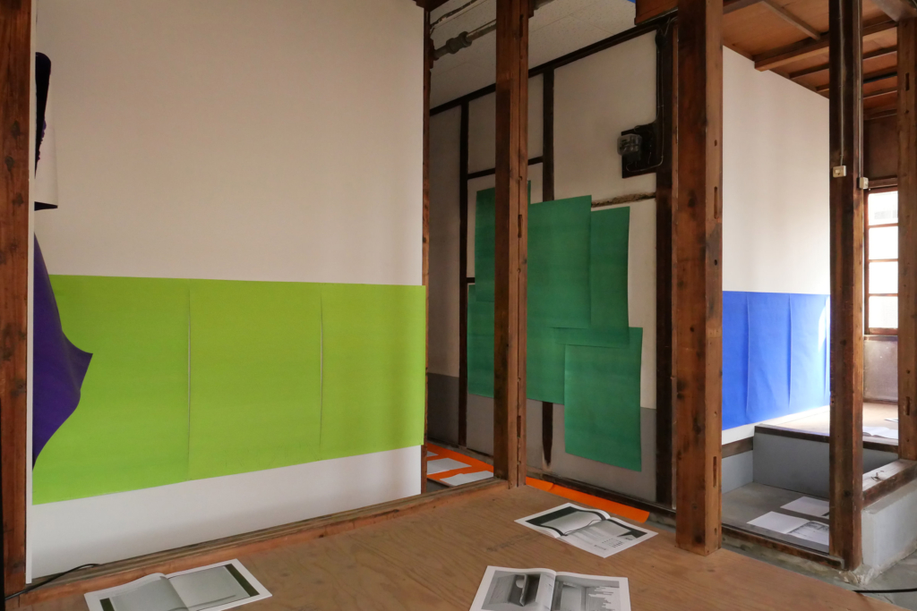 本とポスターに対する二人の個人的な記憶や経験を起点とした今回の展示では、それぞれが追求してきた二つのメディアを交差させ、Shin Shinとして築いてきた協働の軌跡と、各々の個別の活動がどのように接点を生み出すのかを探求した。本が読まれ、ポスターが見られるという形式、記録と印刷のあり方、固定された構造と流動的な解釈の違いを横断しながら、二つのメディアが互いを照らし合い、広がりを生み出すような関係を提示した。福岡の本屋青旗 Ao-Hata Bookstoreと同時に開催し、異なる場所での実験を行った。